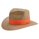 The best way to stay cool is keep the sun off your head and at the same time let the air circulate. This men's straw hunting hat is the perfect solution. Stylish and protective 2⅜" snap brim. Fitted with cotton sweatband and trimmed with blaze band. Men's straw hunting hat in earth. Panama straw fiber. USA. Sizes: S(6 3/4 ), M(7-7 1/4 ), L(7 1/2 ), XL(7 3/4 ).